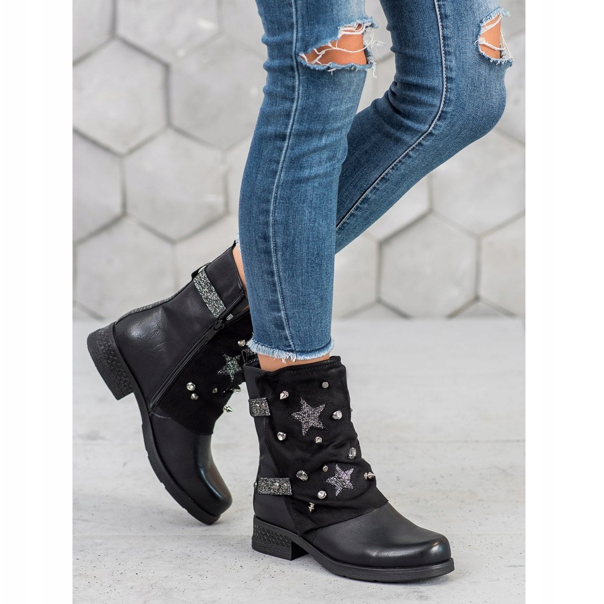 Ao apontar para os detalhes, é impossível ignorar strass prateados e padrões em forma de estrela. Constituem um sotaque único, introduzindo um espírito rock ao seu visual e acrescentando elegância. O salto plano de 3,5 cm é discreto e confortável para usar o dia todo.