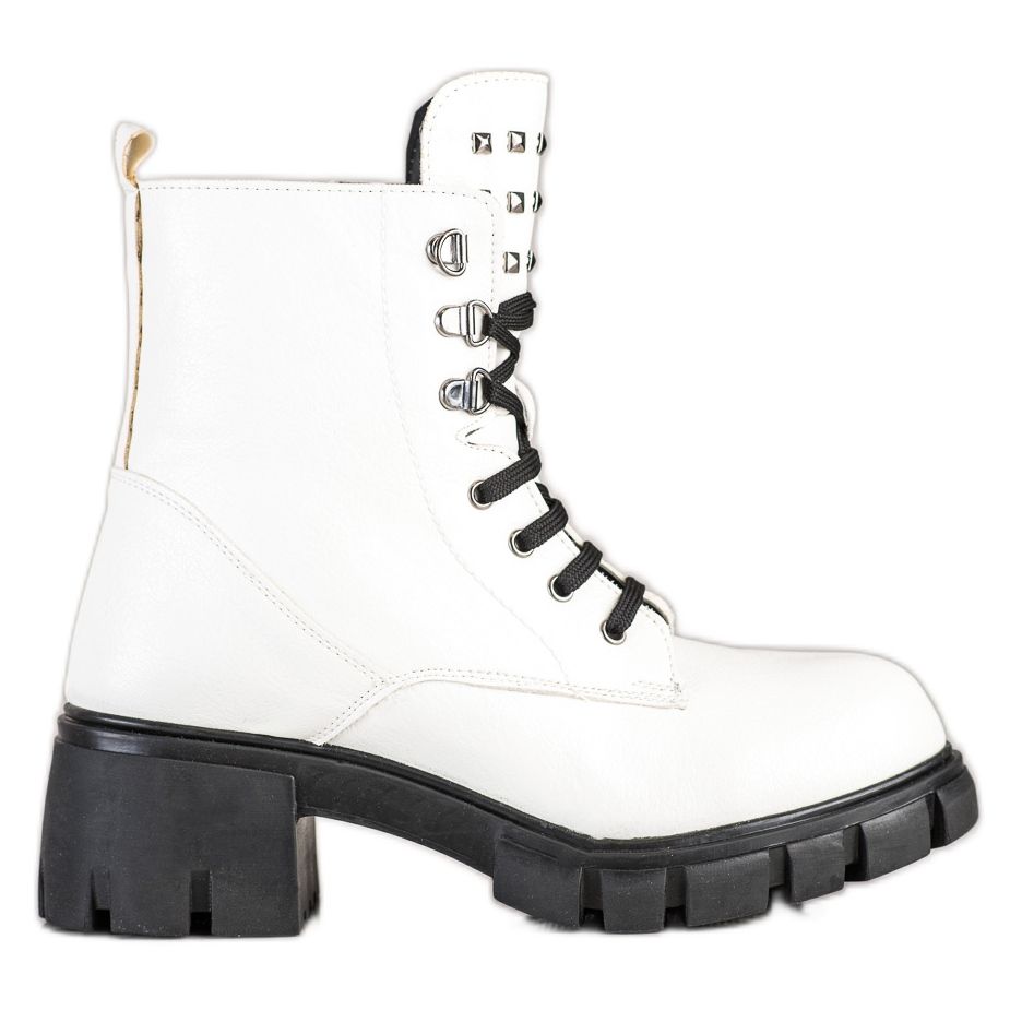 Aqui está uma proposta perfeita para os amantes de um estilo mais forte - botas de trabalho da moda com tachas da SHELOVET! Estas botas bovver brancas combinam um caráter rock com um design casual, o que as torna perfeitas para o uso diário, tanto com os seus jeans favoritos como com saias rock.