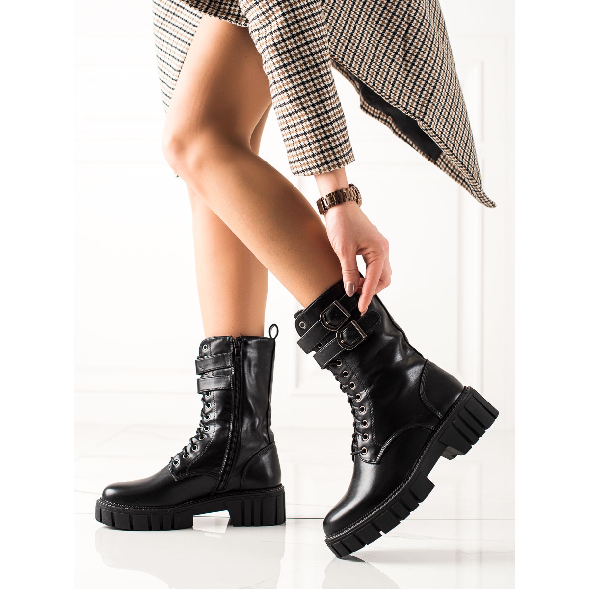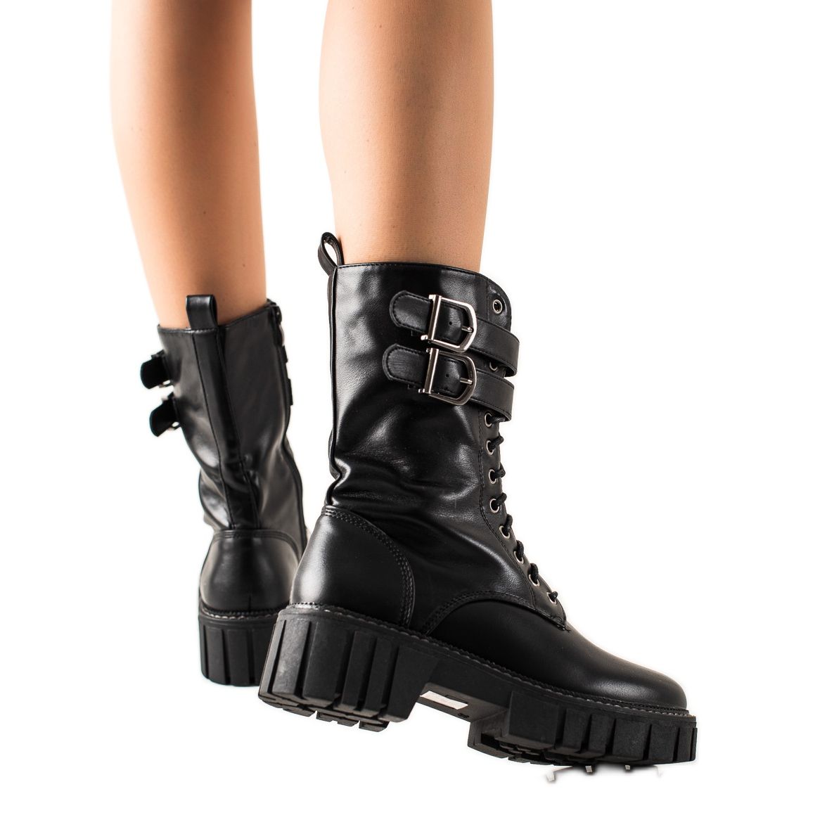 As botas pretas de trabalho distinguem-se por uma fivela decorativa, o que lhes confere um pouco de carácter e as torna um complemento atraente para qualquer look. Graças ao cano alto, que chega acima do tornozelo, e à plataforma de 3 cm de altura, são uma excelente opção para os dias mais frios.