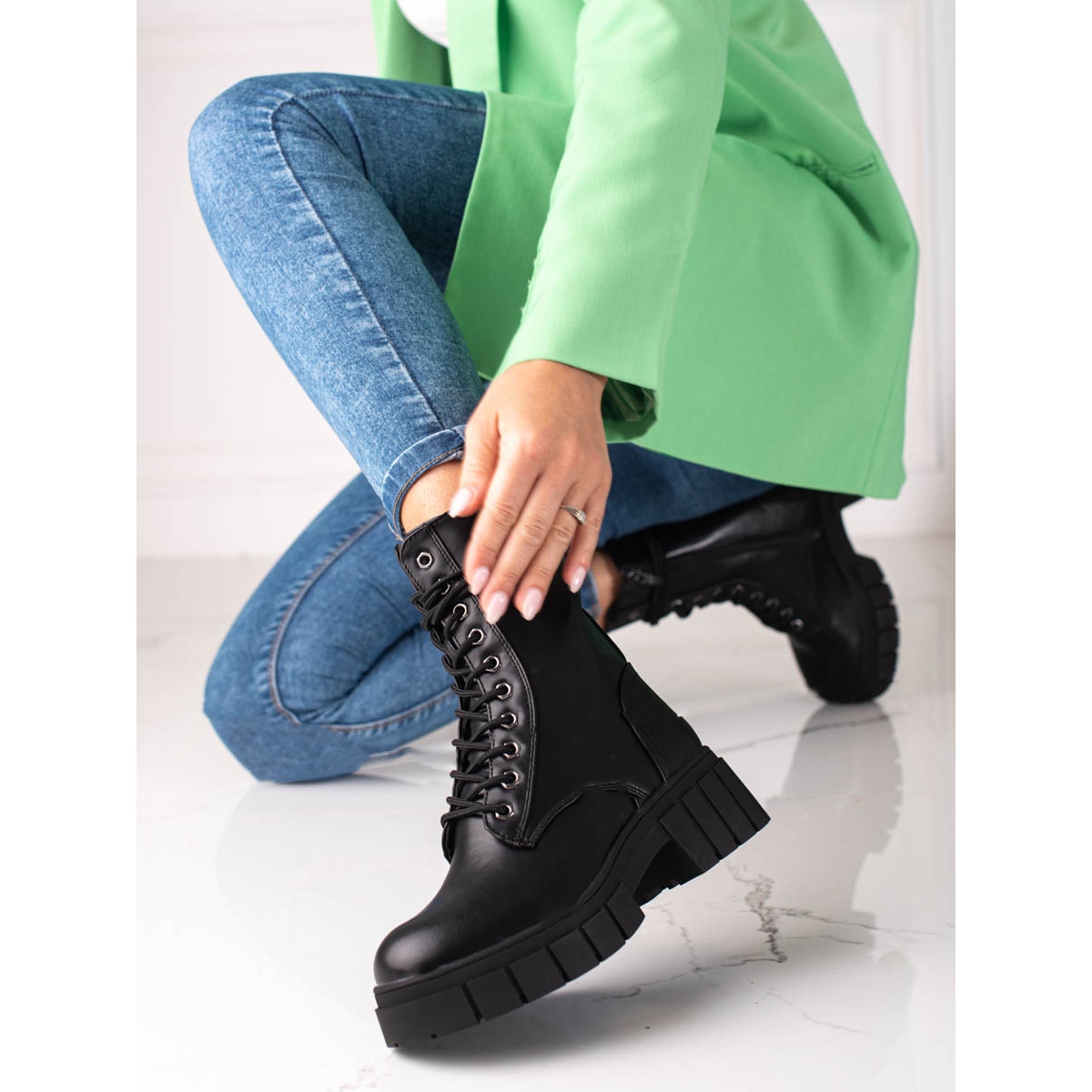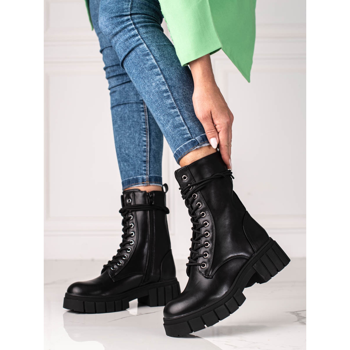 Apresentamos as botas femininas de trabalho Shelovet com sola grossa, que são a escolha perfeita para o outono e inverno que se aproxima. Estes elegantes botins pretos combinam o estilo casual e rock, tornando-os um elemento versátil de qualquer guarda-roupa.