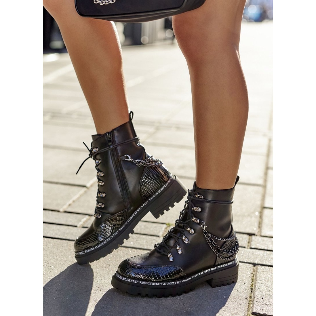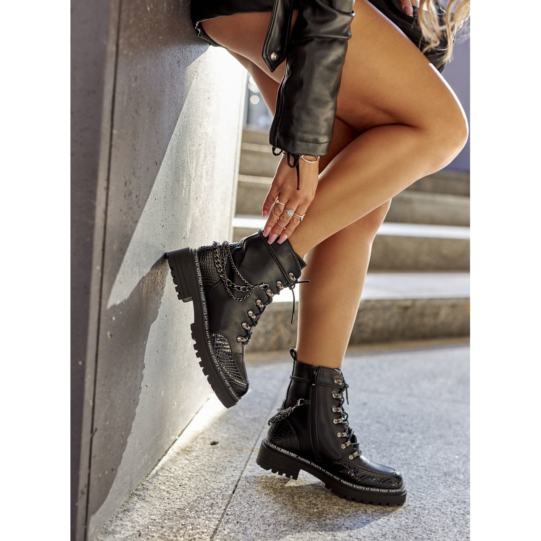 Os trabalhadores femininos práticos e elegantes feitos de couro ecológico, que combinam uma aparência urbana e crua com conforto. O interior isolado com um cobertor de calçados macios oferece conforto e calor nos dias mais frios. Decorado com correntes de metal para um sotaque elegante, equipado simultaneamente com o laço e uma trava lateral confortável - fácil de usar e ajustar em termos de ajuste.