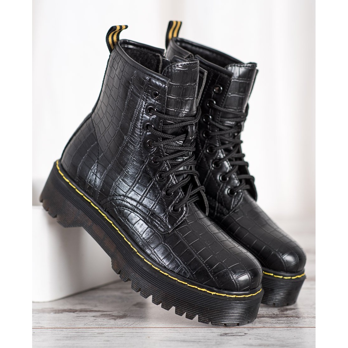 Este modelo está equipado com um prático laço e um zíper adicional, que facilita a colocação e a retirada do calçado. A sola com banda de rodagem de 5 cm de altura proporciona uma boa aderência e um conforto excepcional, que irá apreciar em dias longos e activos. Além disso, uma plataforma de 4 cm de altura fará com que suas pernas pareçam mais finas e você se sinta confiante e elegante.