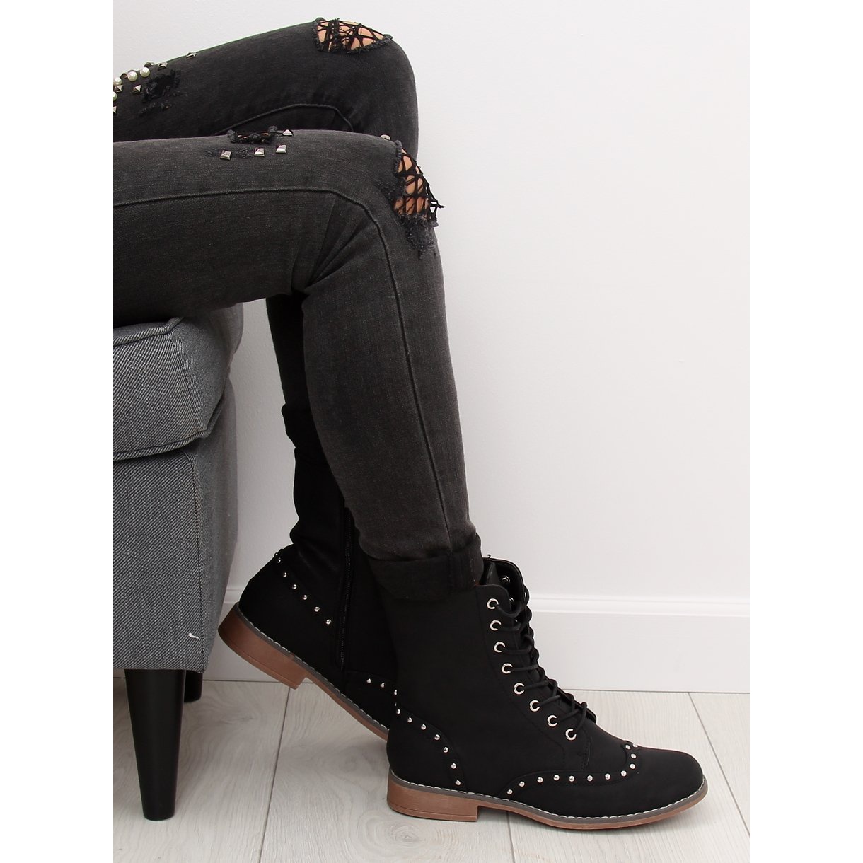 Apresentamos a bolsa preta com tachas B5211-KB - a combinação perfeita de conforto e estilo atraente que certamente irá animar o seu guarda-roupa de outono. Estas botas femininas com atacadores e salto plano distinguem-se pelo cano alto, decoradas com tachas da moda e costuras originais na biqueira, o que lhes confere um carácter único.