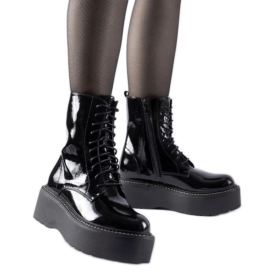 Seu design com cordões garante um ajuste perfeito ao pé, e o salto plataforma médio confere elegância e estabilidade. Este é um modelo ideal para a geração jovem que quer se destacar com um estilo original. Os trabalhadores de patentes pretos combinam perfeitamente com vários looks, enfatizando o caráter casual e elegante de cada estilo.