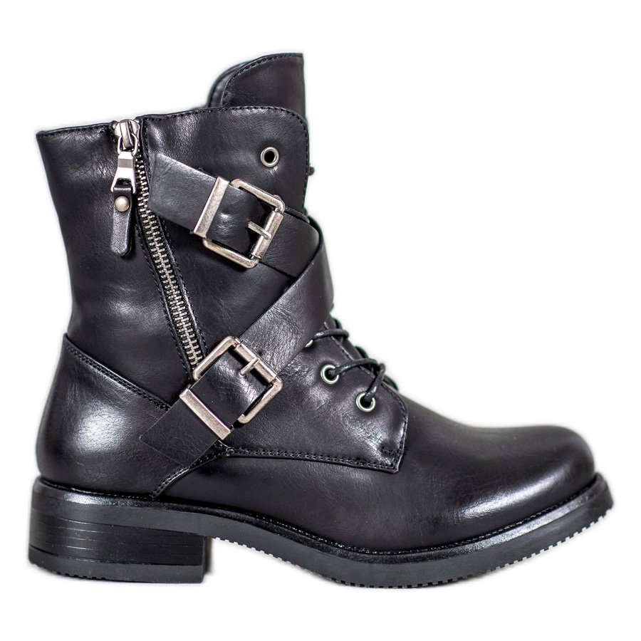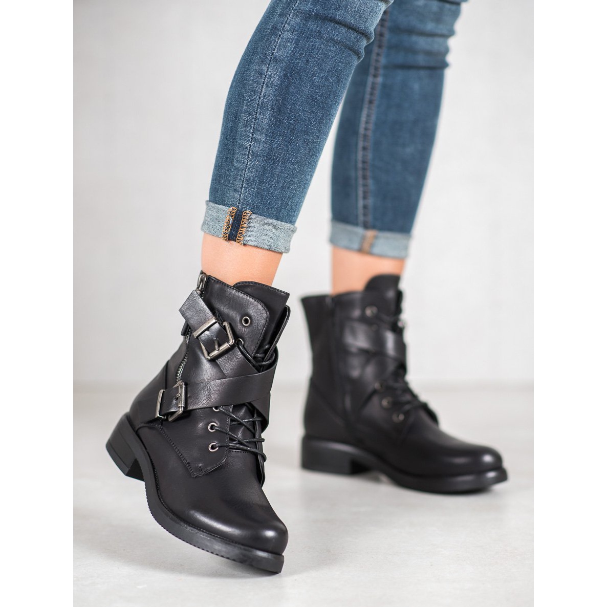 A parte superior que chega acima do tornozelo não só protege contra o frio, mas também confere elegância ao calçado. Graças ao prático fecho de renda e ao fecho decorativo lateral, colocar e tirar o trabalhador é uma brincadeira de criança. As tiras adicionais com fivelas conferem-lhes um carácter rock, perfeito para o uso diário.