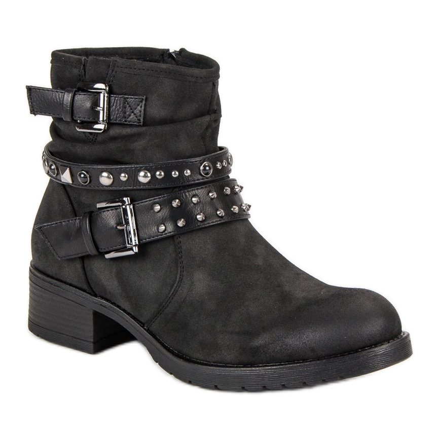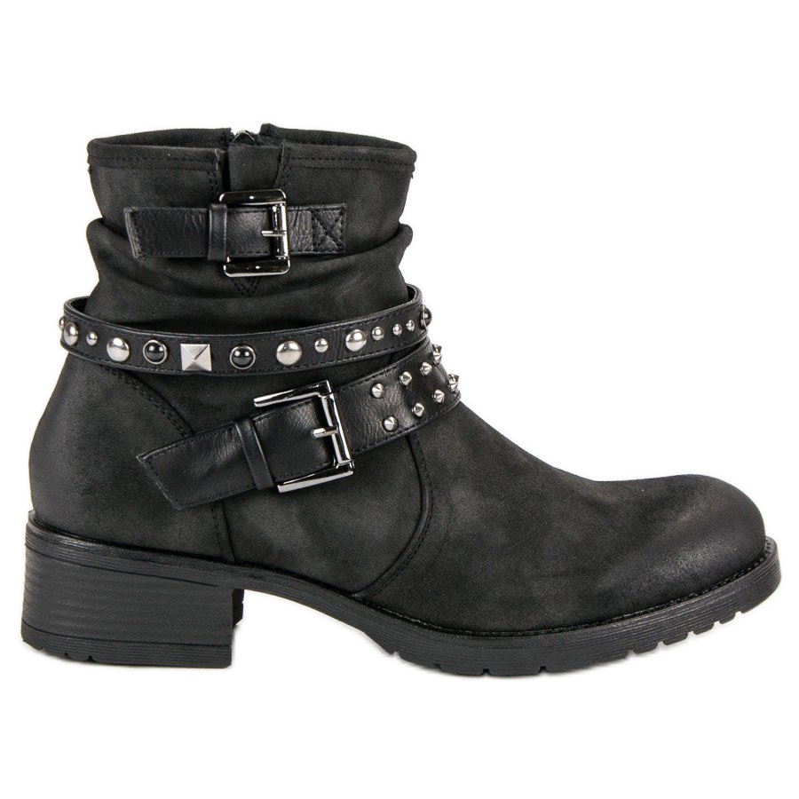As trabalhadoras negras VINCEZA são a escolha perfeita para toda mulher corajosa que deseja se destacar na multidão. Estas botas elegantes, feitas de couro ecológico de alta qualidade, combinam elegância com design moderno. Suas fivelas decorativas características e detalhes em forma de strass e tachas conferem-lhes um caráter rock e único, combinando perfeitamente com o estilo casual.