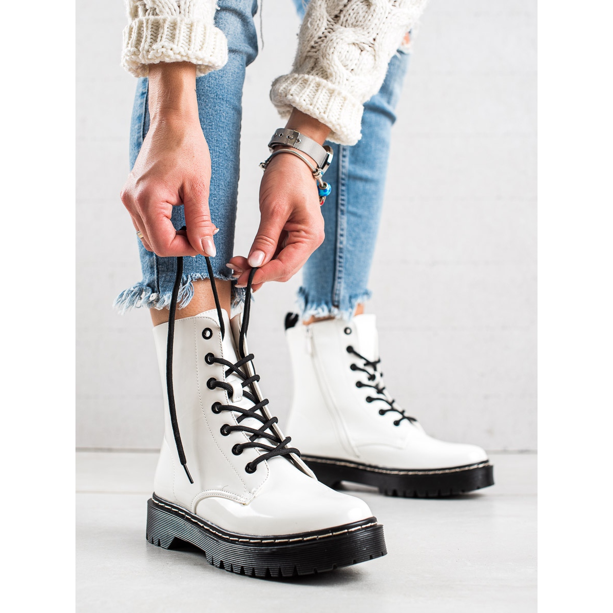 Trappers femininos modernos e práticos de Vinceza, ideais para a temporada de outono/inverno. A combinação de uma glande clássica corta com um acabamento elegante e envernizado em uma cor branca elegante e uma sola preta contrastante.