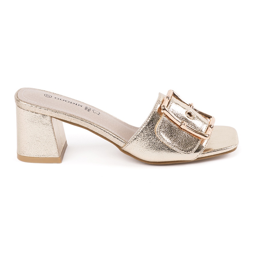 Apresentamos chinelos de tweed em cores douradas da renomada marca Goodin - a combinação perfeita de elegância e conforto, que certamente complementará a cada estilização de verão. Esses chinelos são distinguidos por um acabamento metálico, o que lhes dá um brilho especial, atraindo os olhos a cada passo.