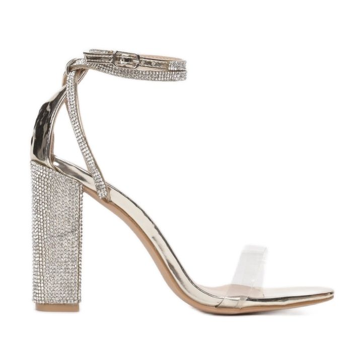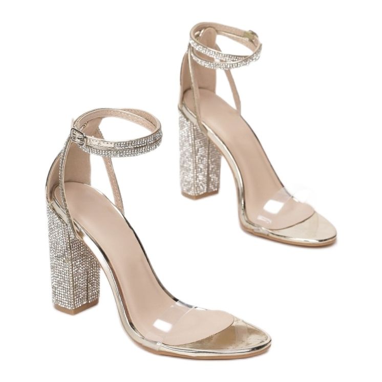 A altura do salto de 10,5 cm, assente num salto bloco, permite adicionar alguns centímetros de altura garantindo conforto ao caminhar. O fecho com fivela facilita a colocação e a retirada, e elementos adicionais, como strass e strass, conferem às sandálias um caráter e brilho únicos.