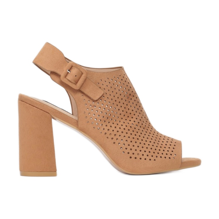 A parte superior das sandálias é vazada, com perfuração sutil, o que garante não só um visual atraente, mas também respirabilidade. Graças à fivela que fecha no tornozelo, você pode ajustá-los com precisão ao pé, o que garante um uso confortável. A biqueira e o calcanhar abertos acrescentam leveza e estilo.