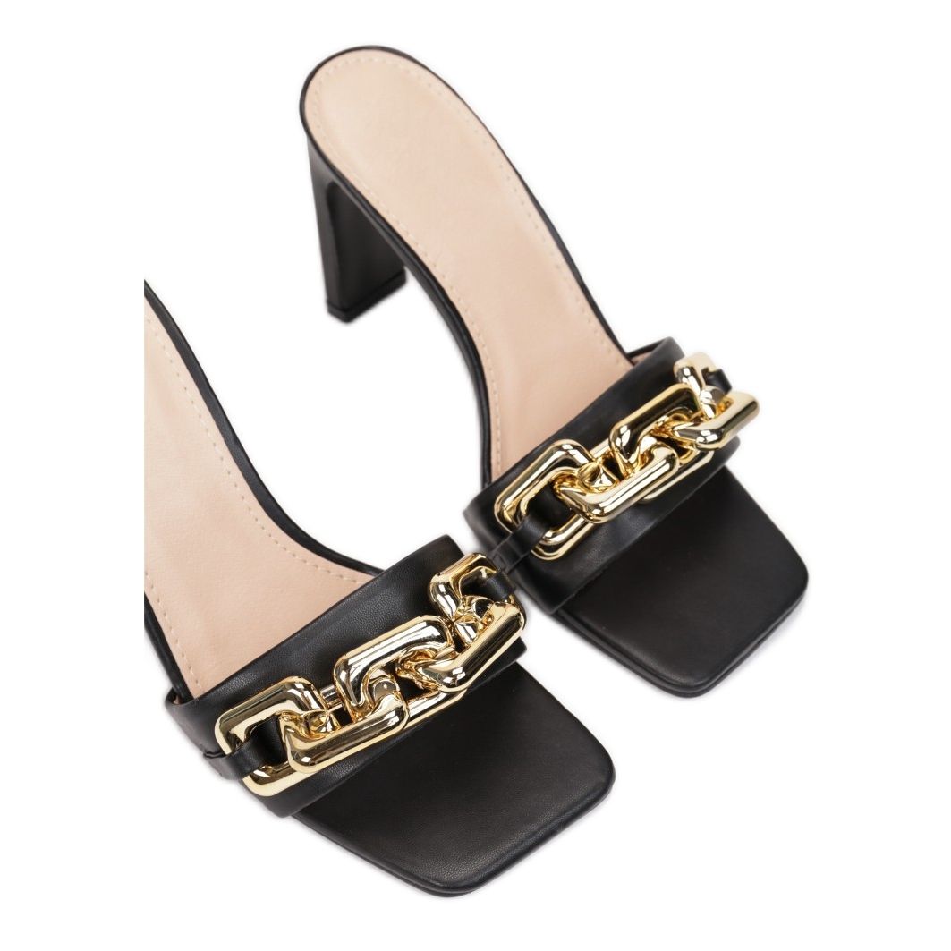 Apresentamos os chinelos de salto alto Vices 1C-38 numa elegante cor preta que irão certamente deliciar todos os amantes da moda. Seu design clássico foi complementado com um toque moderno - uma corrente de ouro decorando um cinto largo. Os chinelos têm salto de 9,5 cm, o que confere uma silhueta mais esbelta e ao mesmo tempo garante um uso confortável graças ao design slip-on.