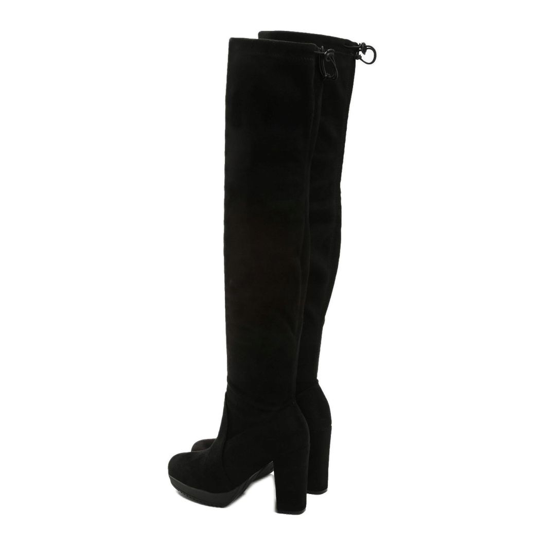 Um elemento característico destas botas é um cano alto que chega acima do joelho, o que acrescenta estilo e cria uma silhueta atraente. A biqueira redonda e o salto de 10 centímetros tornam o calçado confortável e estável apesar do salto alto, perfeito para longas caminhadas ou passeios noturnos.