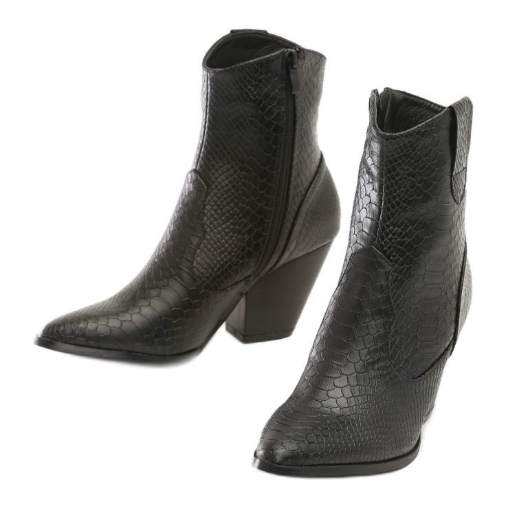 Apresentamos as botas de cowboy exclusivas Vices 3329-38 na clássica cor preta, que serão um complemento perfeito para qualquer estilo de outono e inverno. Estes sapatos originais, fechados com um prático zíper, são confeccionados em couro ecológico de alta qualidade, que imita efetivamente a pele de cobra.
