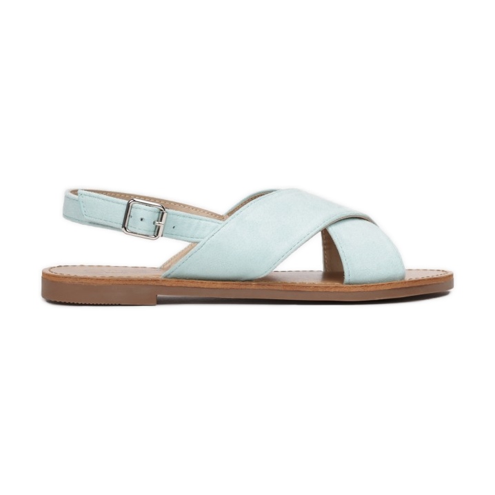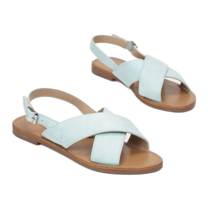 As sandálias são equipadas com fecho de fivela acima do tornozelo, o que permite um ajuste perfeito ao pé e garante conforto de uso. Biqueira e calcanhar abertos conferem leveza, e a biqueira arredondada enfatiza ainda mais seu caráter elegante. As tiras cruzadas em camurça ecológica garantem não só um look fashion, mas também um suporte adequado para o pé.