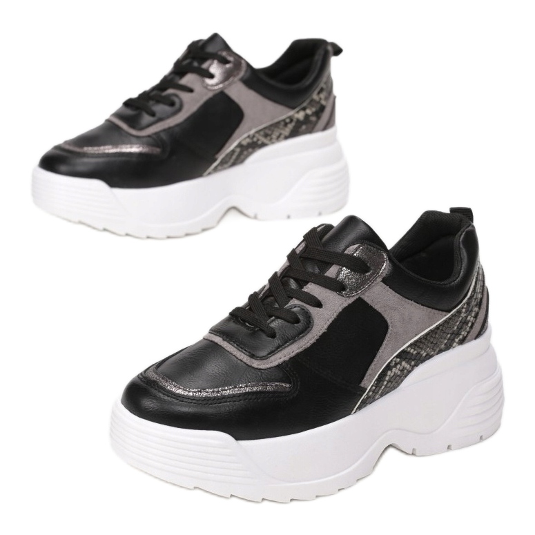 O tênis feminino Vices 8541-38 na cor preta é a escolha perfeita para mulheres que valorizam estilo e conforto. Estes calçados esportivos com atacadores se distinguem por um design moderno, graças a uma sola grossa com relevo que garante conforto no uso. Confeccionados em couro ecológico e camurça ecológica de alta qualidade, os tênis são decorados com costuras elegantes e inserções que imitam pele de cobra, o que lhes confere um caráter único.