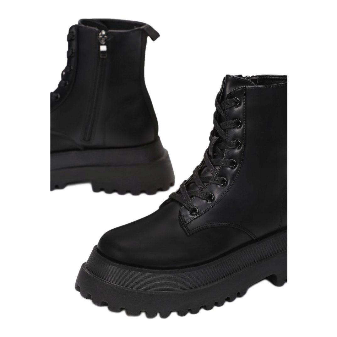 As botas têm bico redondo, o que lhes confere charme, e a clássica cor preta as torna extremamente universais - fáceis de combinar com vários estilos. O fecho em renda permite um ajuste preciso ao pé, o que aumenta ainda mais o conforto de uso.