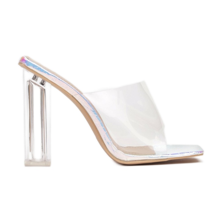 Um poste alto de 11 centímetros com base quadrada adiciona estilo e torna cada silhueta fenomenal. Uma alça larga localizada na frente suporta eficazmente os dedos, garantindo estabilidade ao caminhar. Os materiais transparentes utilizados no calcanhar e na tira conferem à amada leveza e visual moderno.