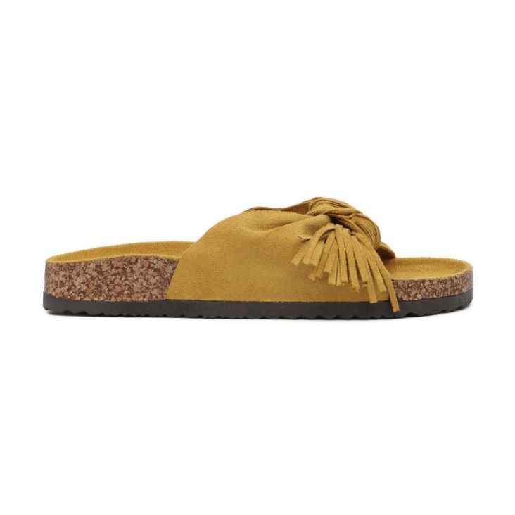 Uma tira larga na ponta, amarrada com uma tira combinando com franjas decorativas, chama a atenção e confere aos chinelos um caráter único. Confeccionados em camurça ecológica de alta qualidade, os chinelos combinam elegância e praticidade, e sua sola sintética garante durabilidade e conforto ao longo do dia.