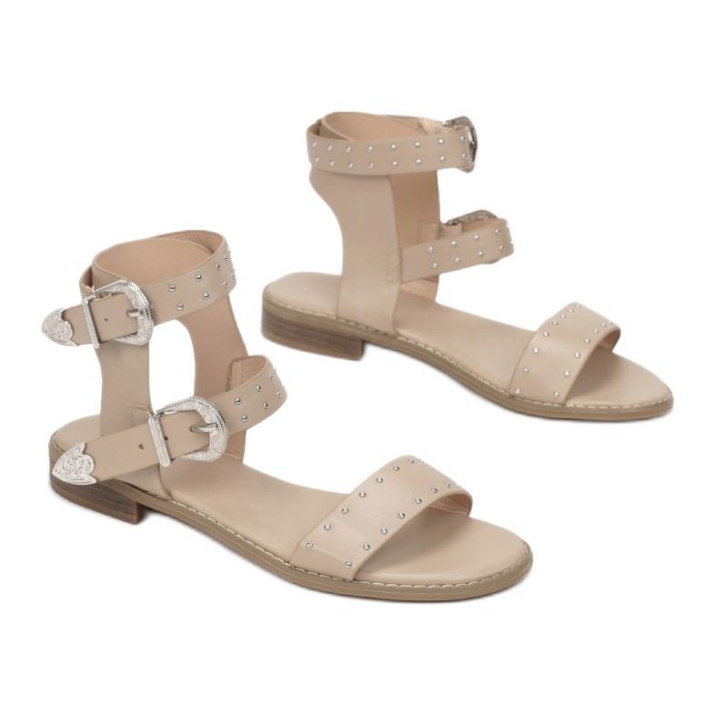 O design das sandálias encanta com tiras largas na ponta e no tornozelo, que são decoradas com rebites e fivelas chamativas, conferindo-lhes um acabamento estiloso. Confeccionadas em couro ecológico de alta qualidade, tanto o cabedal quanto a palmilha garantem durabilidade e facilidade de cuidado, o que os torna uma solução prática para o uso diário.