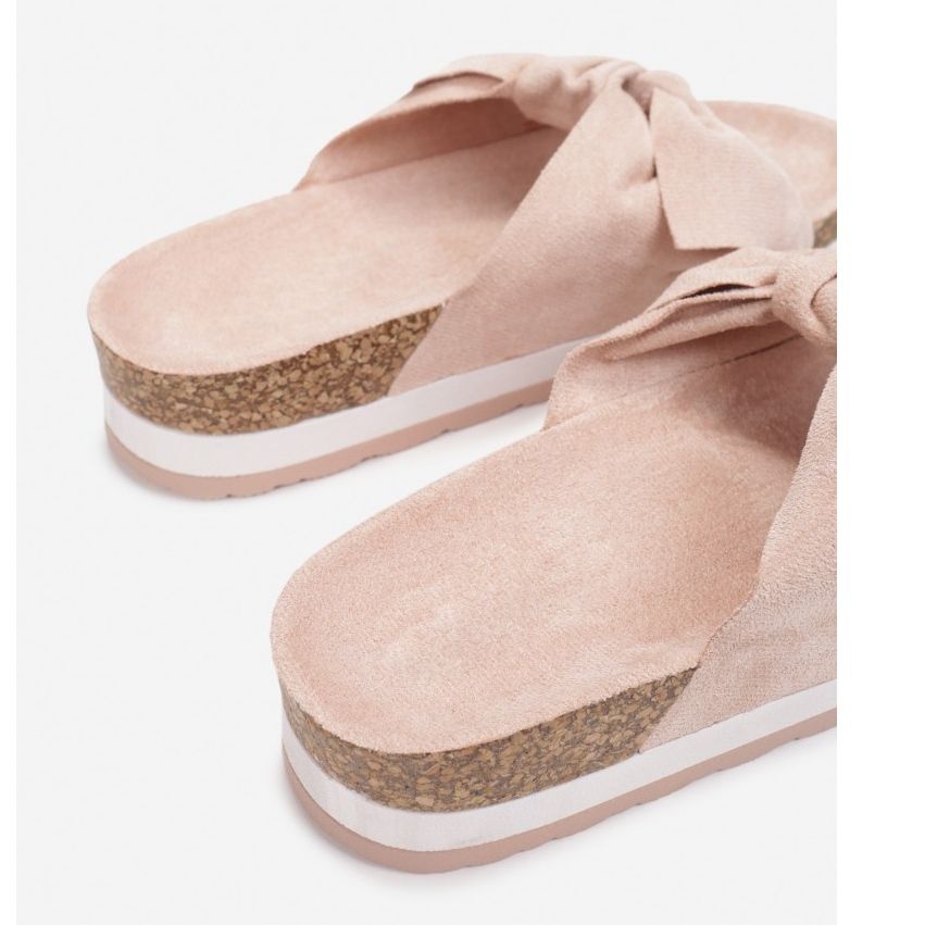 Uma tira larga decorada com um laço charmoso não só chama a atenção, mas também proporciona suporte adequado para o pé. Feitos em camurça ecológica, estes chinelos não são apenas estéticos, mas também práticos e fáceis de manter limpos.
