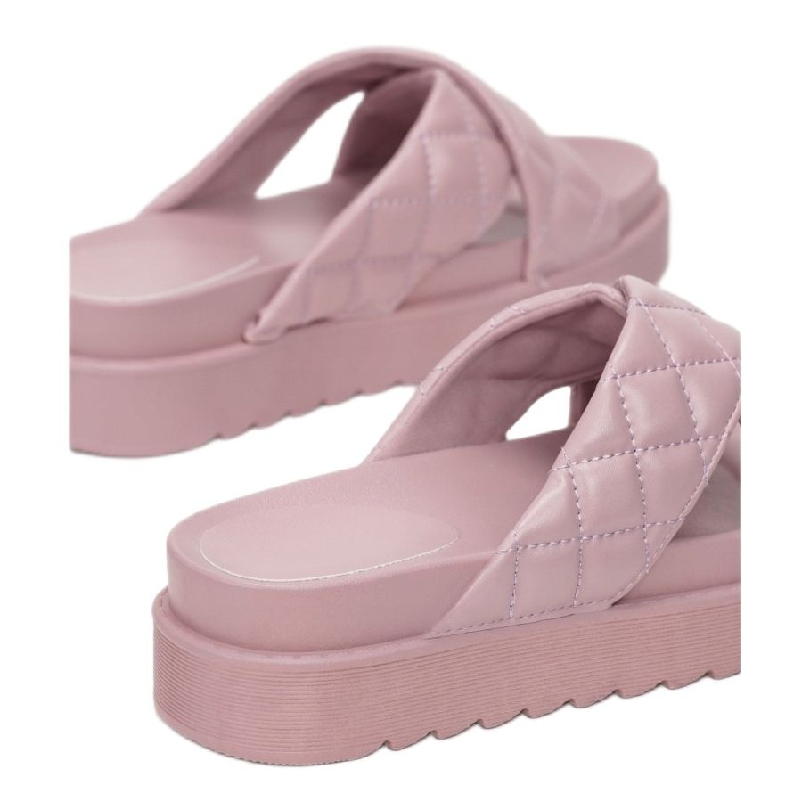 Feitos em couro ecológico de alta qualidade, os chinelos apresentam tiras cruzadas que acrescentam estilo graças ao padrão acolchoado em forma de diamante. Biqueira e calcanhar abertos, bem como biqueira redonda, fazem deles a escolha ideal para os dias quentes. Além disso, uma sola de material sintético com 4,5 cm de altura e um inserto de borracha proporcionam amortecimento e suporte adequados para os pés.