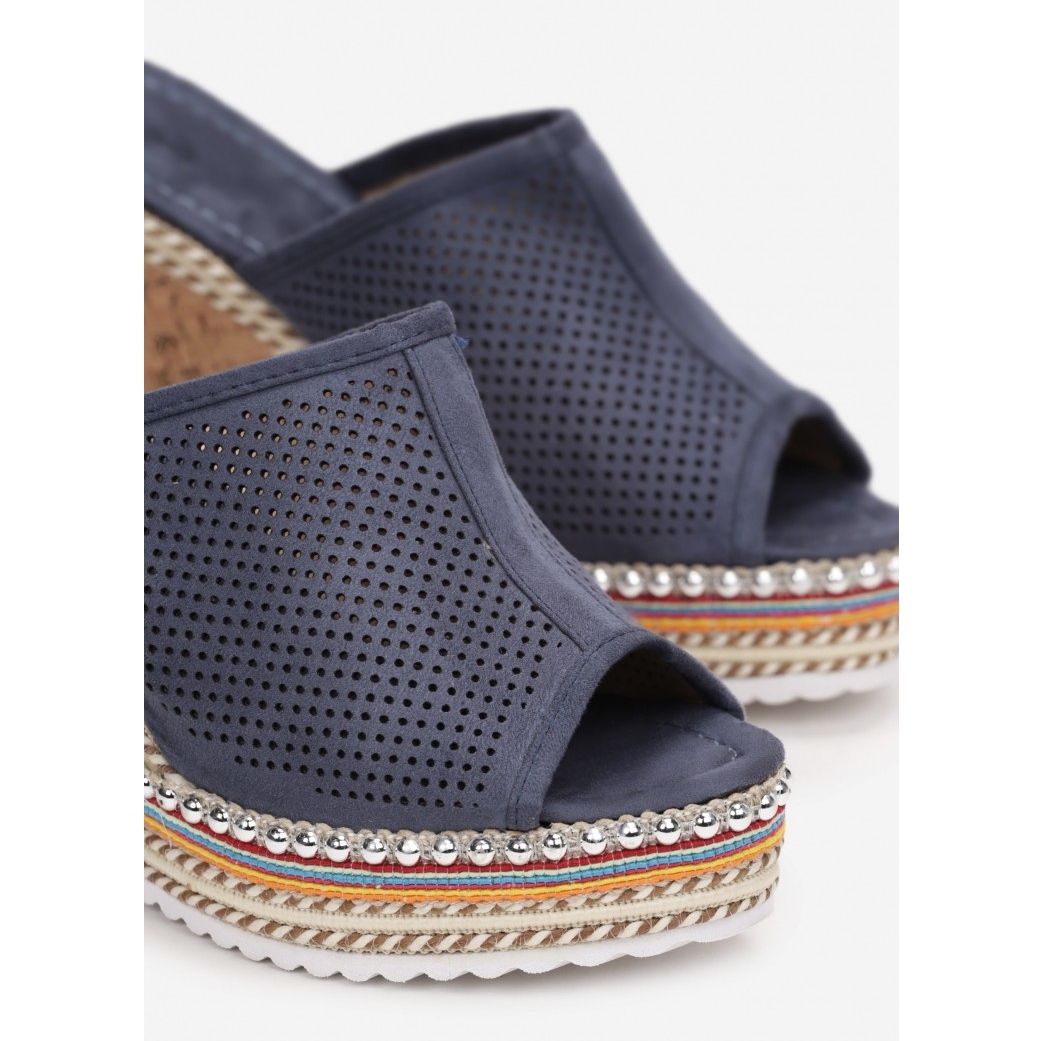 Feitos em camurça ecológica de alta qualidade, esses chinelos não são apenas estéticos, mas também práticos. O design aberto e slip-on torna-os fáceis de usar, tornando-os uma solução perfeita para os dias quentes. Listras largas com recortes vazados e acabamentos e cordões decorativos conferem-lhes um caráter original, e as imitações de pérolas acrescentam um ar de luxo.