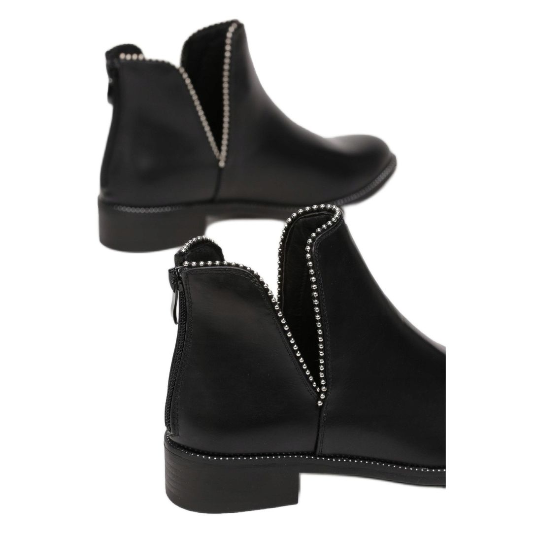 Feitos de couro ecológico de alta qualidade, estes botins não são apenas elegantes, mas também ecológicos. Uma vantagem adicional são os rebites metálicos que decoram as solas e as bordas da parte superior, o que os torna atraentes e com um toque rock chic.
