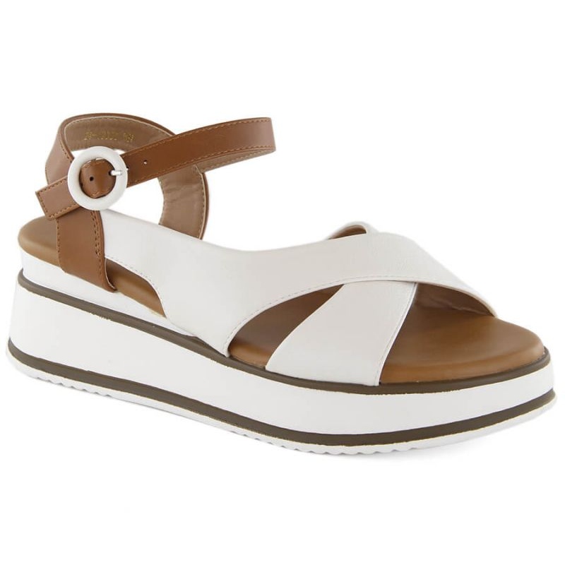 Essas sandálias são presas com uma fivela, o que permite que você se encaixe facilmente a qualquer pé. O superior e o revestimento são feitos de couro sintético, que garante durabilidade e facilidade de cuidados. A cor branca universal faz com que as sandálias se misturem perfeitamente com várias estilizações de verão.