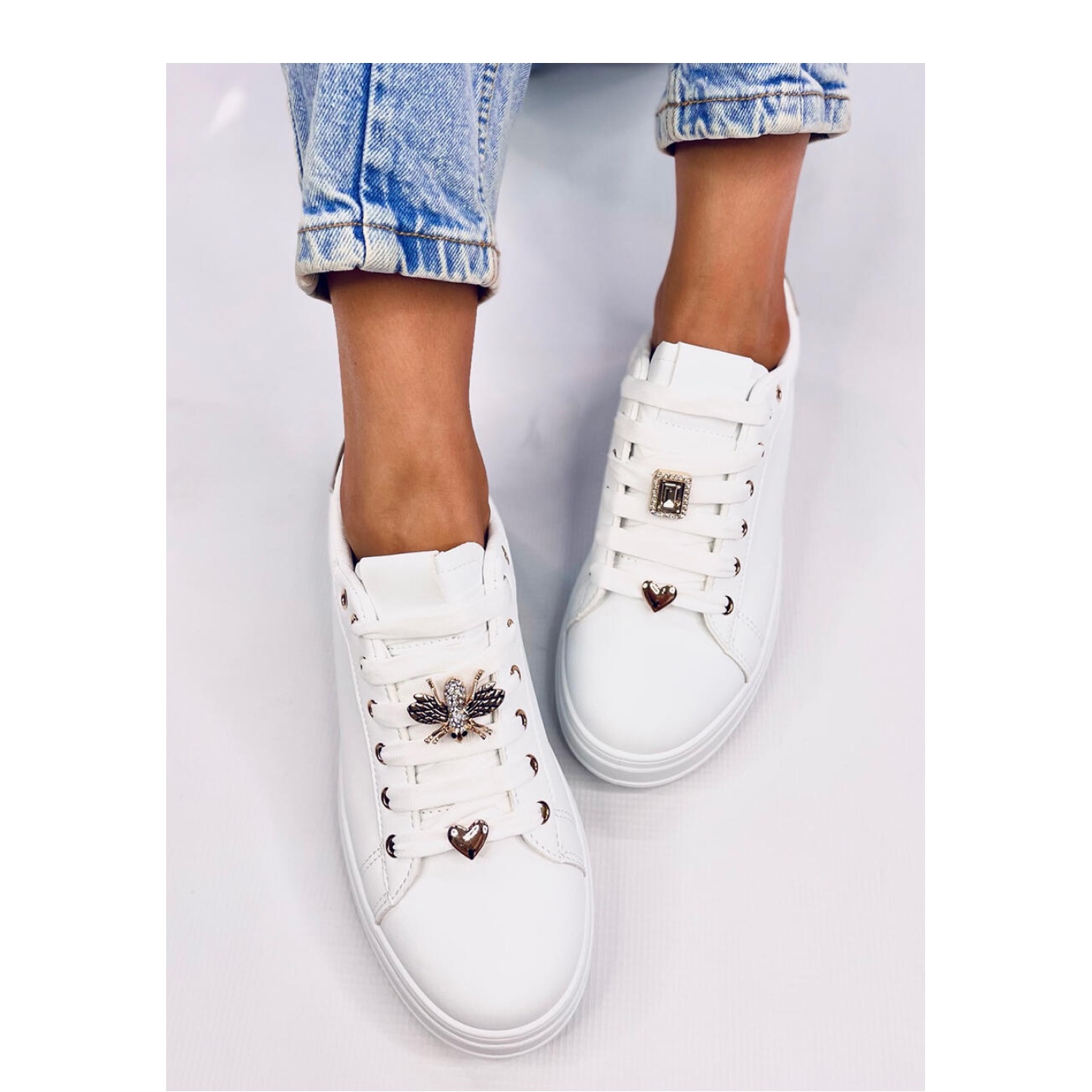 Os tênis na plataforma Yared White/Gold da Inello Brand é uma ótima opção para mulheres que desejam combinar conforto com o estilo da moda. Esses sapatos esportivos brancos são distinguidos não apenas pelo design moderno, mas também com inserções metálicas eficazes e decorações douradas brilhantes que lhes dão um personagem único.