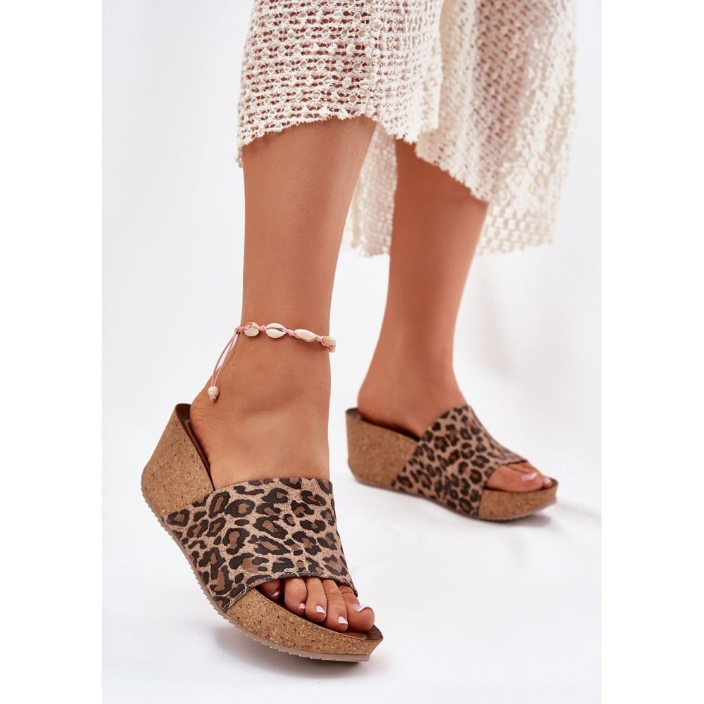 Zazoo Zazoo 40289 chinelos de couro feminino no leopardo da cunha de cortiça bege